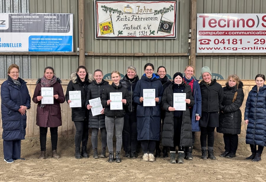 An zwei Wochenenden im Februar und März trafen sich 13 motivierte Teilnehmerinnen zwischen 16 und 54, um sich zur Trainerassistentin ausbilden zu lassen. Gudrun Hofinga, Fachkraft für Lehrarbeit, hat den Lehrgang organisiert und durchgeführt. Sie fand im RV Tostedt eine Anlage, auf der die Möglichkeiten dafür geradezu prädestiniert schienen.