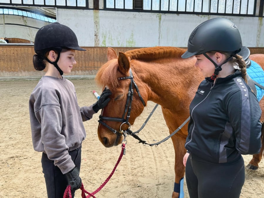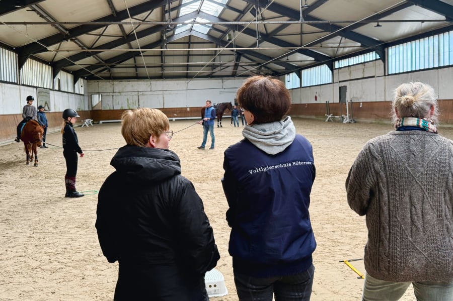 Malte Weichsler, Berufsreiter, Regionstrainer in der Disziplin Springen in der Region Aller-Oker sowie Teilnehmer an schweren Springparcours wie auf dem Hamburger Derby, folgte am Nachmittag mit vielen Ideen aus der Praxis, wie man Reitanfängern das Springreiten näherbringen kann. Er ging darauf ein, wie man Ängsten begegnet und mit Unsicherheiten umgeht. Ein wichtiger Punkt sei der sichere Aufbau von Sprüngen. „Mit Cavalettis, die kaum umfallen und damit ein großes Sicherheitsrisiko darstellen, arbeite ich nicht. Ebenso sehe ich hier und da auch übereinander gestapelte Cavalettis – das darf heutzutage nicht mehr sein, es ist einfach zu gefährlich“, so sein Statement. „Dass Stangen, die am Boden liegen, gegen Wegrollen gesichert werden müssen, steht nicht nur in den Richtlinien – es sollte überall gelebte Praxis sein, um völlig unnötige Verletzungen zu vermeiden. Nicht benötigte Auflagen werden entfernt, das sollte Standard in jedem Reitverein sein“, bat er die Zuhörenden. Vier noch sehr junge Reiterinnen nahmen auf ihren Ponys an Weichslers Unterricht teil. Er übte mit ihnen, kontrolliert und in gleichmäßigem Rhythmus zu galoppieren und stellte sie vor sehr kleine Anforderungen, wie das Springen von Kreuzen. „Die Kinder, deren Teilnahme großartiger Weise von Sylvia Bobrink vom RV Niedersachsen-Eiche organisiert wurde, machten aufmerksam mit und konnten alle einen Mehrwert aus den Unterrichtsstunden ziehen“, so die Initiatorin des Ausbilder-Forums, Gudrun Hofinga, die als Fachkraft für Lehrarbeit im PSV Hannover Vereine und Betriebe unterstützt.