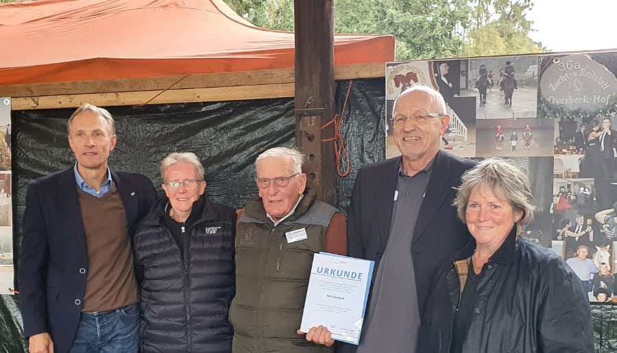 Auf dem traditionellen Herbstturnier des Reitsportvereins Overbeckhof wurde Karl („Kalli“) Overbeck mit der Goldenen Ehrennadel des Landessportbundes Niedersachsen für 50 Jahre Vorsitz im Verein ausgezeichnet.