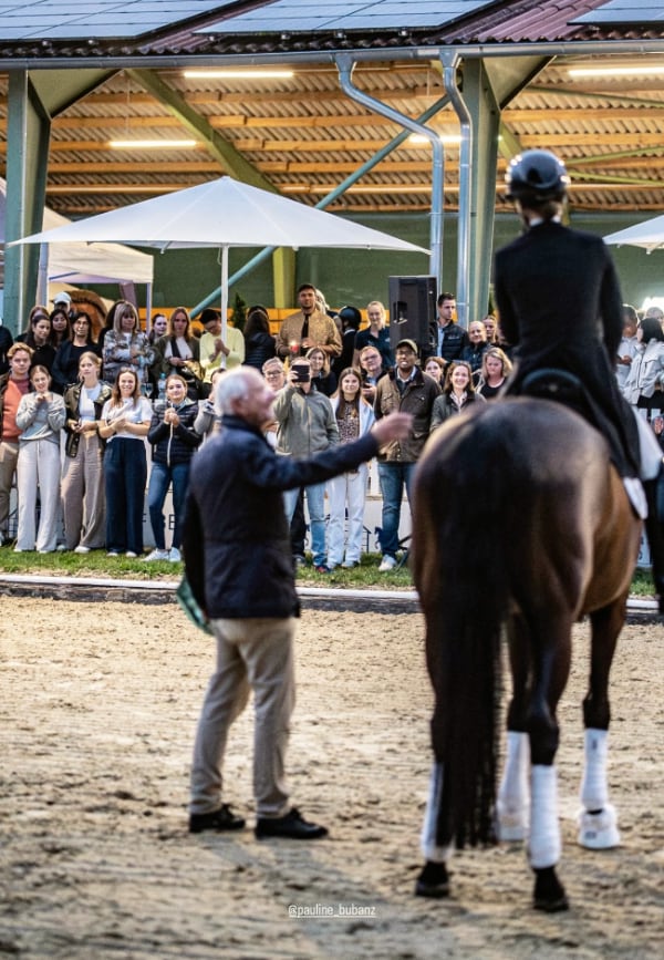 Im Licht der Scheinwerfer – die Sonne begann bereits, unterzugehen und färbte den Himmel des milden Sommerabends dunkelblau mit in einem sanften rosa-orange-Ton – trabte ein dunkelbraunes, langbeiniges Pferd in das Viereck. Sein Name: Dantino Grande. Seine Reiterin: Pauline Bubanz. Christoph Hess betrat das Viereck. Am Rande des Reitplatzes versammelten sich Freunde, Verwandte und Zuschauer. Im Hintergrund spielte epische Musik, Hess begann mit einer Laudatio, die den Weg der jungen Reiterin widerspiegelte. Währenddessen zeigte Pauline Bubanz mit ihrem „Dante“ einige der schwierigsten Lektionen aus der höchsten Klasse der Dressur, dem Grand Prix ehe sie mit einem großen Applaus und dem an den Frack gehefteten Goldenen Abzeichen auf die emotionale Ehrenrunde geschickt wurde.