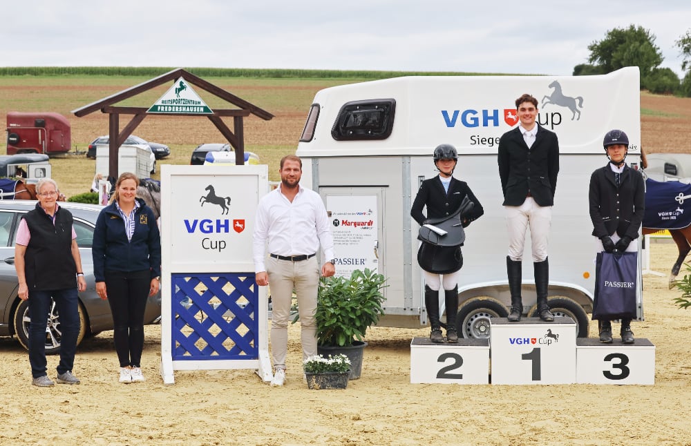 „Die Freude bei Familie Tidow war riesengroß, alle fielen sich in die Arme. Schließlich hatte Christin Tidow, die Tante von Mattes Helmke, 2006 das VGH Cup Finale gewonnen. Ich erinnere mich noch gut, als ihr Vater damals vor dem Springen sagte, dass sie einen neuen Pferdehänger gut gebrauchen könnten, da bei dem alten schon einiges kaputt sei. Solche Geschichten schreibt der Springsport, dass nun Mattes den zweiten Hänger innerhalb der Familie gewinnt“, freute sich der Vereinsvorsitzende Jörg Fredershausen. Zweite wurde Anna-Sophia Heuer (RV Völksen) mit Huckelbarry, die im Stechen ebenfalls alle Stangen liegen ließ (42,69 Sekunden). Ein Fehler im Stechen kostete Celina Weis (RV Zeven) mit Cornet’s Cylano den Sieg, denn sie legte die schnellste Runde hin (37,68 Sekunden). Ebenfalls einen Fehler im Stechen verbuchte die vierplatzierte Henriette Hagemann (RFV Hankensbüttel) mit Skyjackerin (38, 67 Sekunden). Auf den Plätzen fünf und sechs folgten Jouline Bareither (RFV Meißendorf) mit Asti Cinzano und die Schwester des Siegers, Lale Marie Helmke (RF Stall Tidow) mit Coleman.