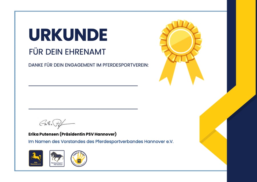 „Im Zuge dessen stellen wir auch die neue Urkunde des PSV Hannover als Dankeschön für junge Menschen vor, die sich ehrenamtlich in ihrem Pferdesportverein engagieren. Unsere Vereinsvorstände können sich die Vorlage im Download-Bereich der Homepage unter „Vereine“ oder „Landesverband/ Ehrungen“ zum Ausdrucken herunterladen. Dann müssen nur noch Name und Verein des/der Jugendlichen ausgefüllt werden, um sie zum Beispiel auf der Jahreshauptversammlung zu ehren. Somit gibt es neben unseren Ehrennadeln und Plaketten für die Erwachsenen, die über die PSV App beantragt werden können, auch eine Möglichkeit die jungen Mitglieder, die ehrenamtlich helfen und sich im Verein einbringen, in den Mittelpunkt zu stellen“, so Anne Janßen, Geschäftsführerin des PSV Hannover.