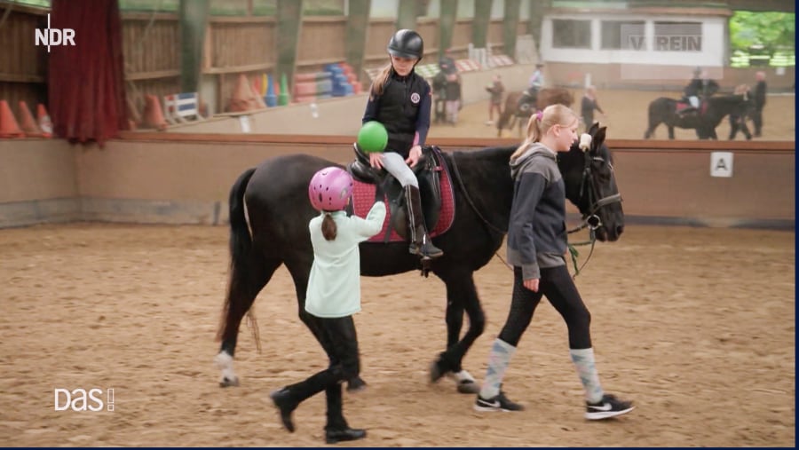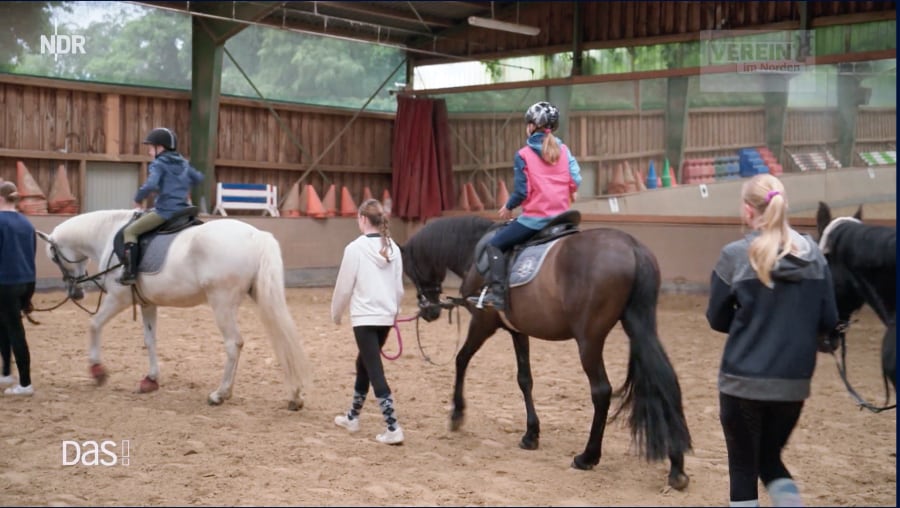 Vier Hufe, zwei Herzen, eine  Verbindung lässt die Teilnehmenden, Kinder ab acht Jahren auf spielerische Weise Reiterfahrungen sammeln. Der pensionierte Lehrer, selbst contergangeschädigt, stellt die solide Grundausbildung für ReiterInnen und Pferde in Theorie und Praxis in den Mittelpunkt. Der Spaß bei Pferdepflege und Gemeinschaftsspielen miteinander und mit den Pferden werden dabei gleichwertig gesehen. Jede Gruppe wird von zwei Übungsleitern begleitet. Jedes gerittene Pferd wird zudem von einem Helfer betreut, der das Pferd auch während der Reitstunde führt. Menschen und Pferde in Gemeinschaften, die Leben verändern: ein sehenswerter Beitrag im NDR Fernsehen (ab ca. Minute 33.50). G. Eickmeyer, Fotos: NDR/ DAS aus der Sendung v. 15. Juni
